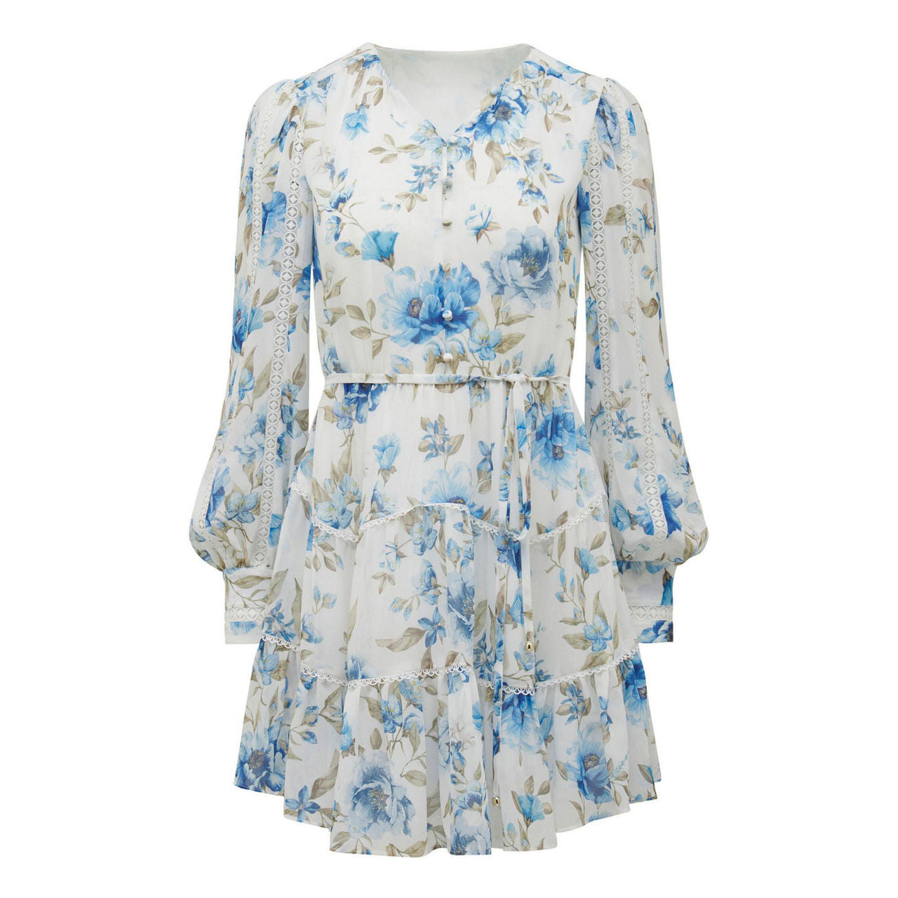 - Long blouson sleeves, V-neck, button fastening, cinched waist, frill hem, floral pattern
