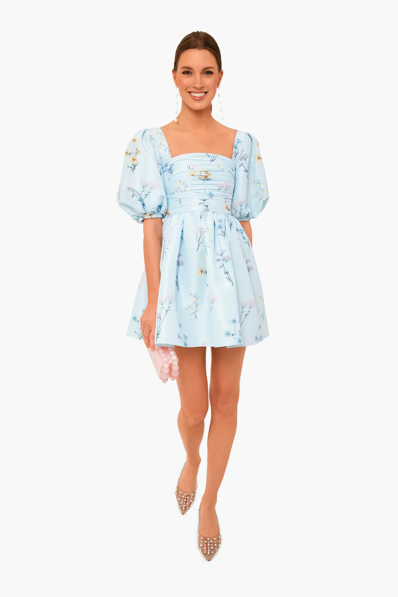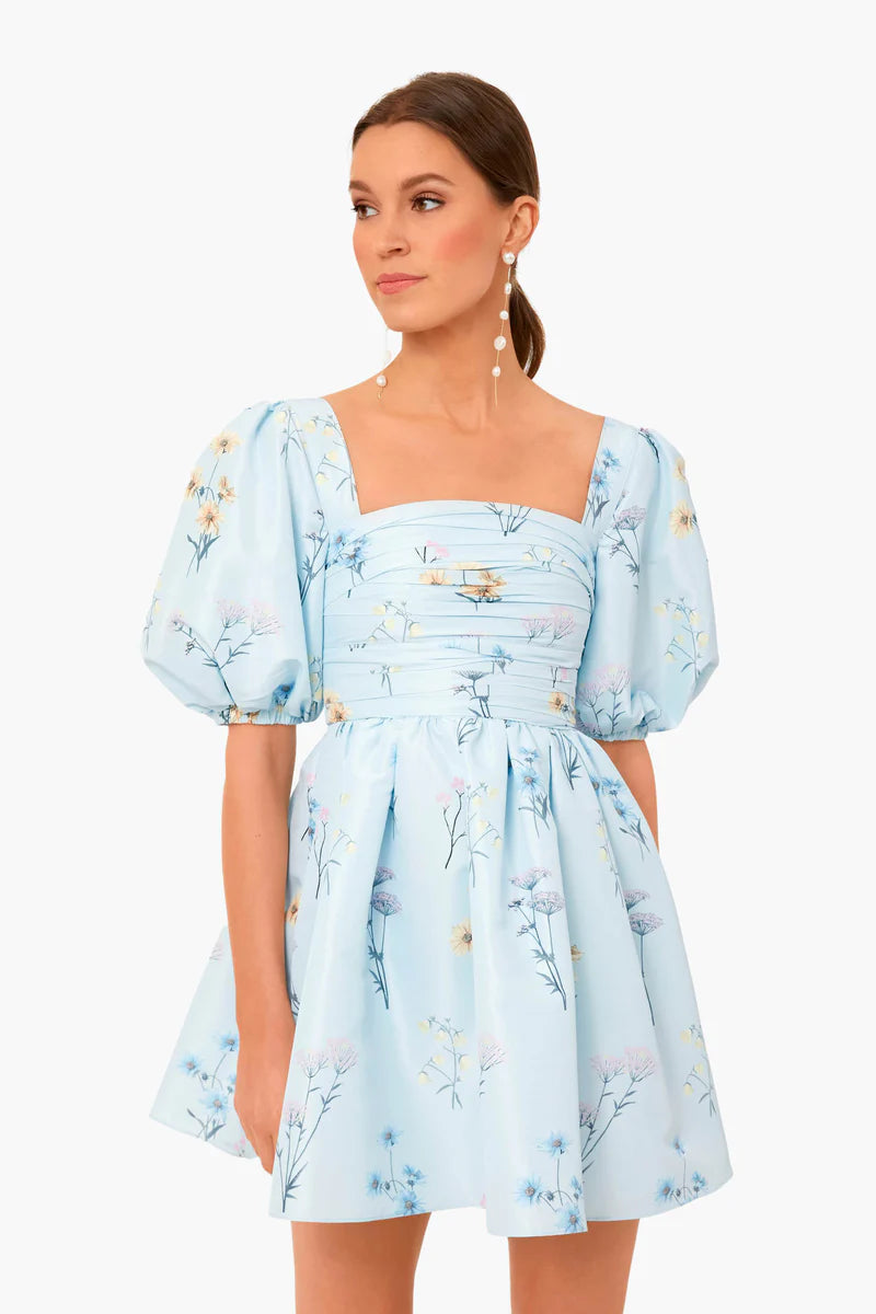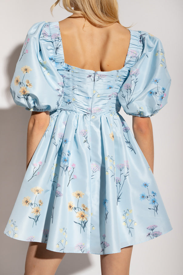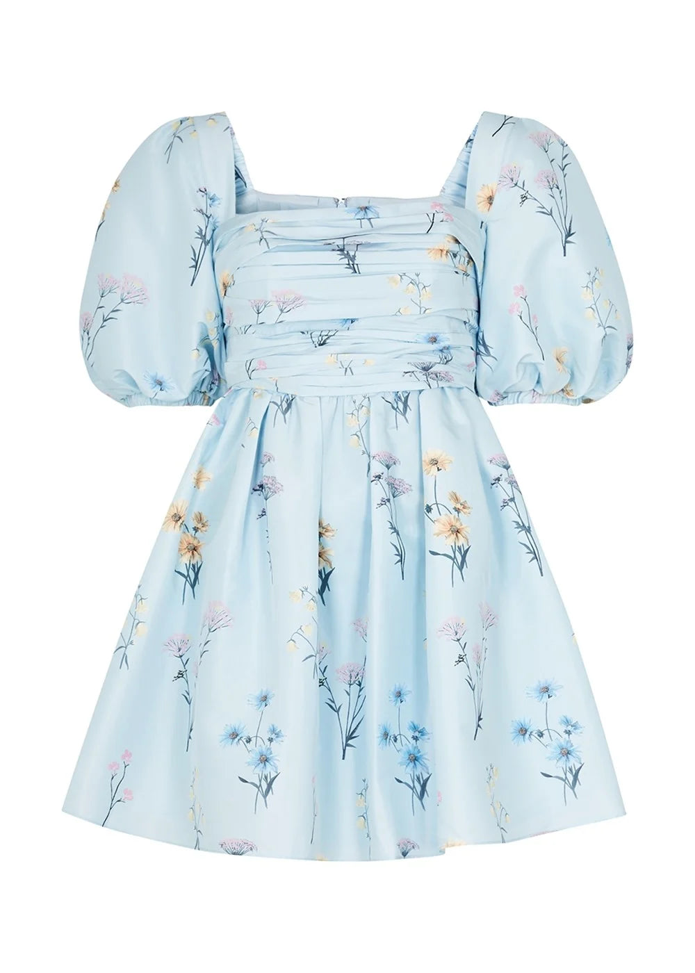 - Fastened with a back zip and hook, this garment features a multicolored floral motif, decorative draped details, side pockets, square toe and short puff sleeves.